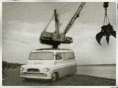 "I found this picture in some of my Great Uncle's old photo's. I had no idea that he was once a Spiflicator driver on the banks of the Mississippi, where he loaded parts bound for the Chrysler factory using his specially imported Bedford Spiflicator. Apparently he worked there until he sent a shipment of wings to Austin Rover instead of some unpressed Steel."